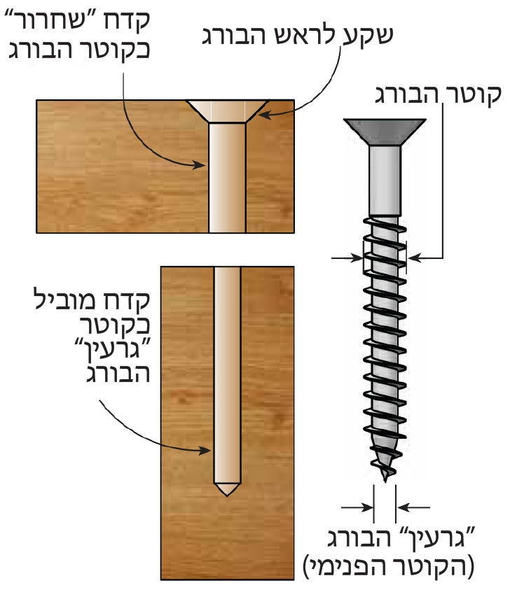 קוטר הקדח המוביל צריך להתאים בערך לקוטר הגרעין של הבורג (מעט יותר קטן עבור עץ רך).